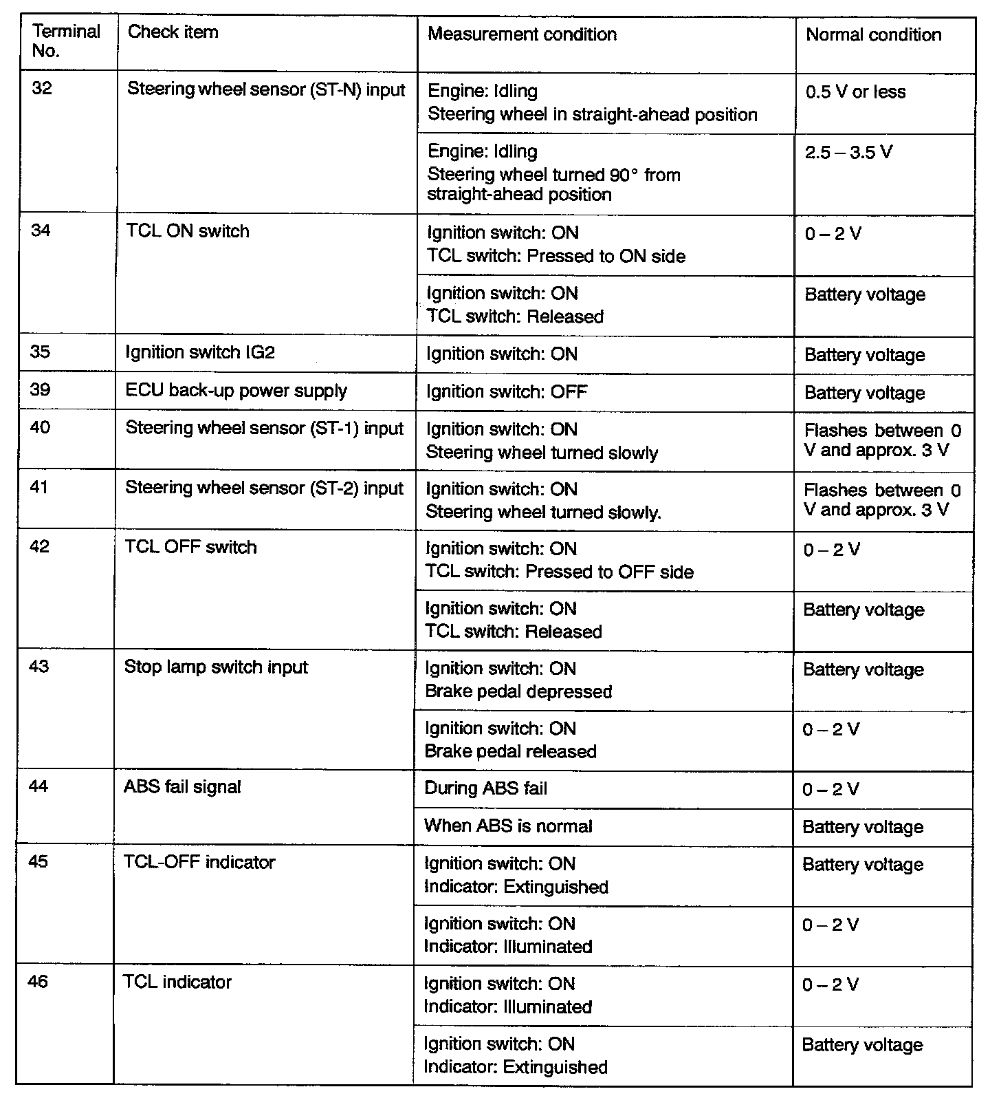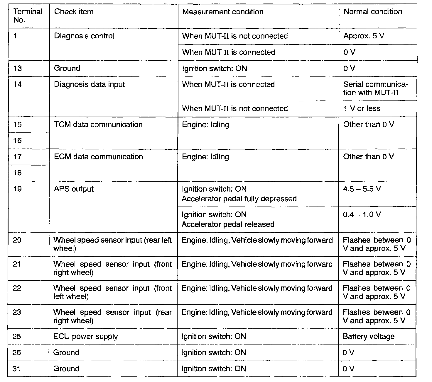 3. Measure the voltage at the terminals of the ABS-ECU harness-side connector while referring to the check chart.