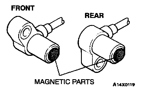 1. Check whether any metallic foreign material has adhered to the parts shown in the illustration at the speed sensor tip, and if so, remove it.