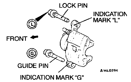 Install the guide pin and lock pin as illustrated so that each head mark of the guide pin and the lock pin matches the indication mark located on the caliper body.