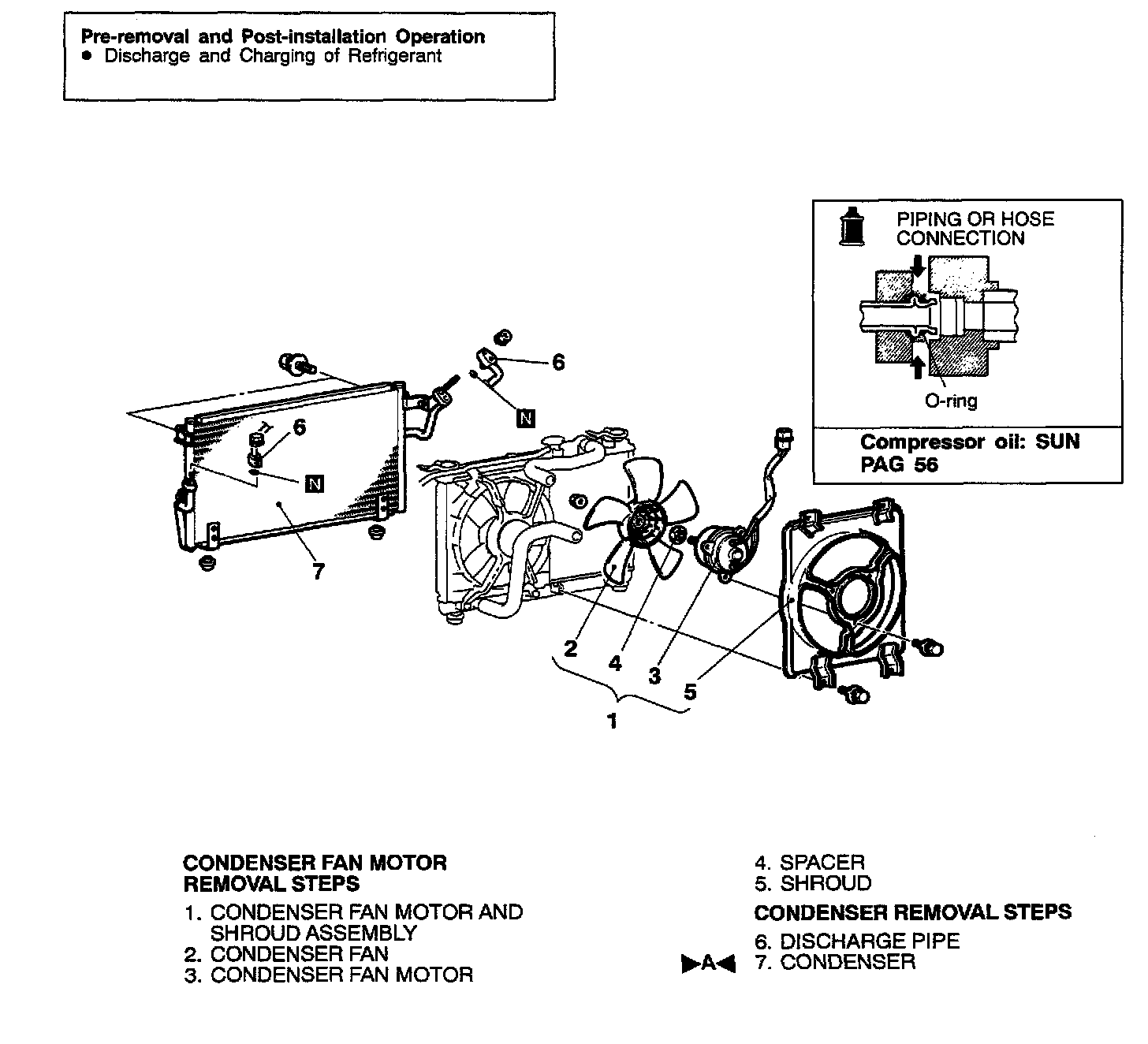 When replacing the condenser with a new one, refill the condenser with a specified amount of compressor oil and install it (to the vehicle).