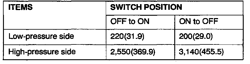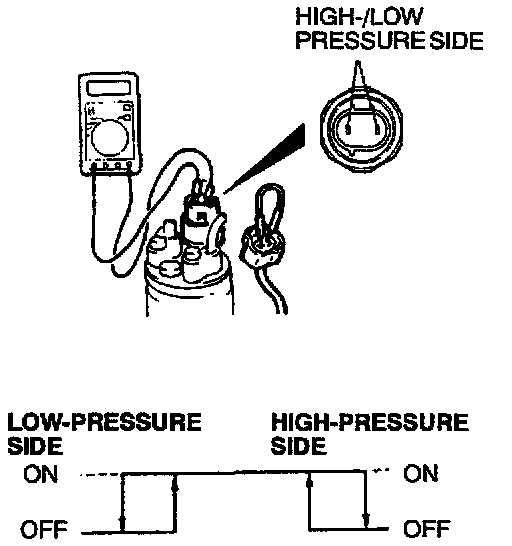 3. When the high/low pressure sides of the dual pressure switch are at operation pressure ON and there is continuity between the respective terminals, then the condition is normal. If there is no continuity, replace the switch.