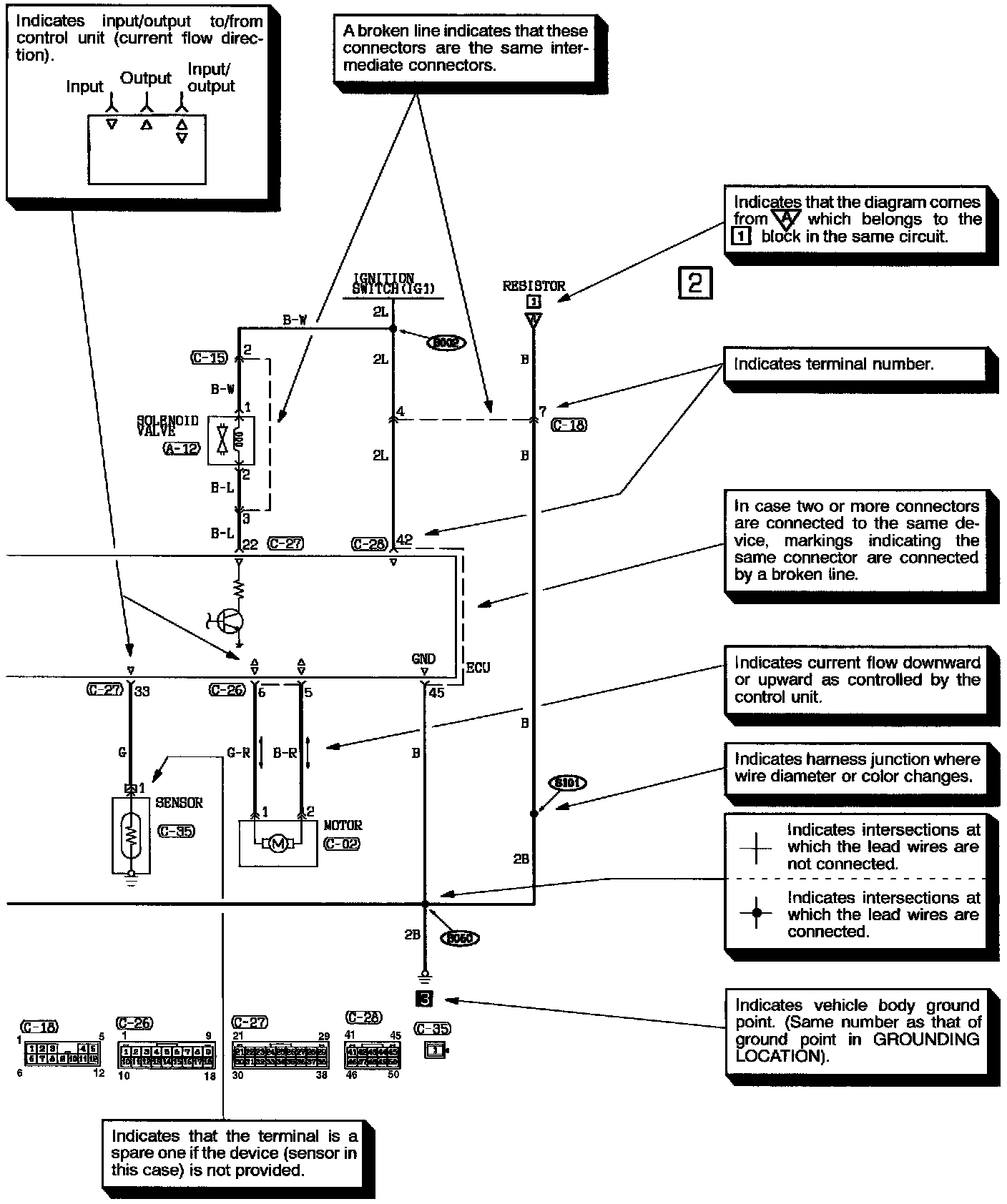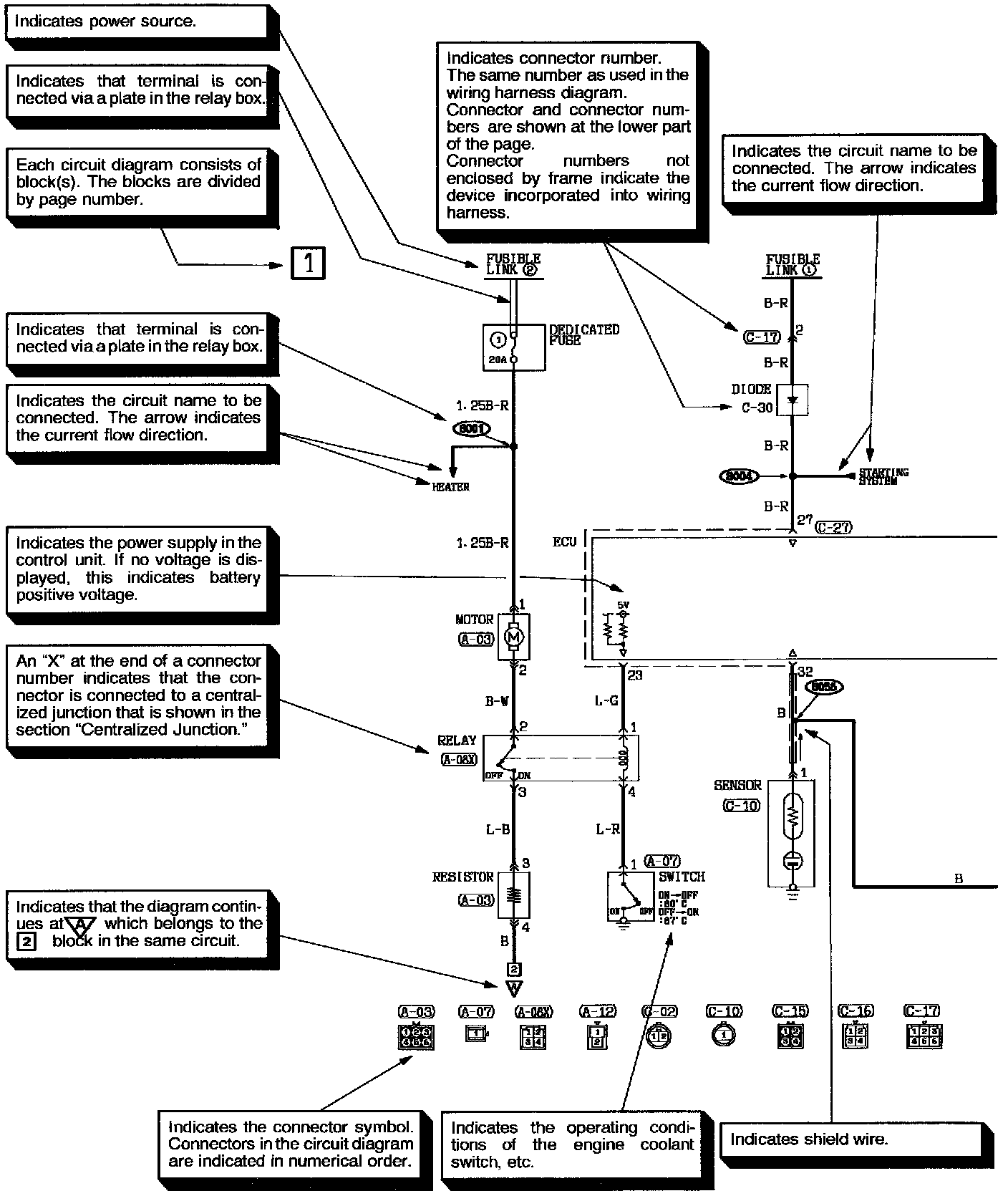 The circuit of each system from the fuse (or fusible link) to ground is shown. The power supply is shown at the top and the ground at the bottom to facilitate understanding of how the current flows.