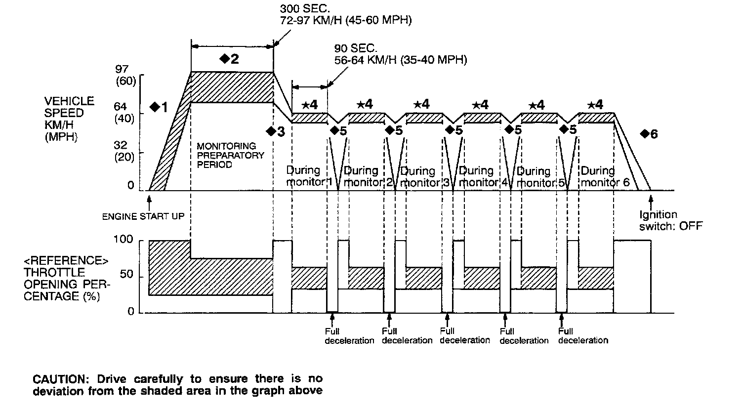 *4: Monitoring period: keep throttle open at a uniform level (minimize throttle variation) and drive for 90 seconds or more at 56 to 64 kph (35 - 40 mph).