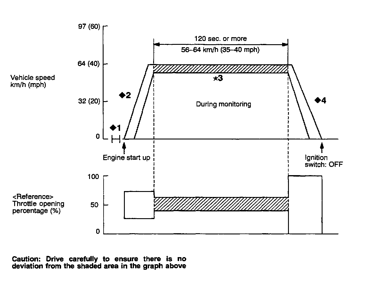 *3: Monitoring period: Keep throttle open at a uniform level (minimize throttle variation) and drive for 120 seconds or more at 56 - 64 kph (35 - 40 mph). Drive steadily during this period, without sudden turning of the steering wheel.