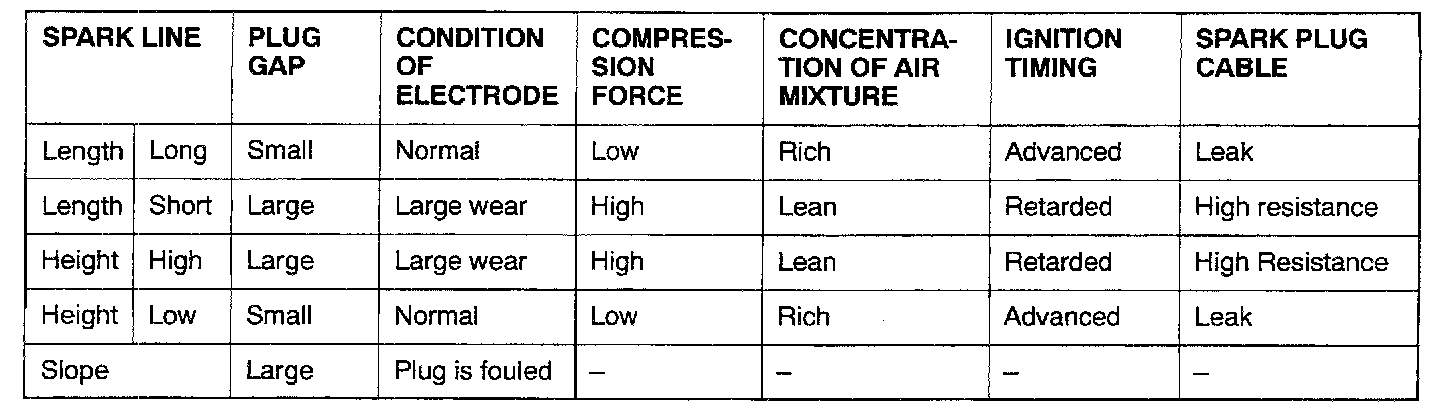 Point A: The height, length and slope of the spark line (refer to abnormal waveform examples 1, 2, 3 and 4) show the following trends.