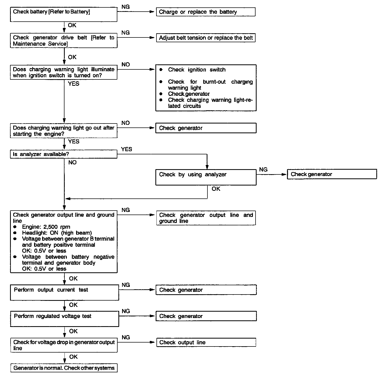 The charging system troubleshooting guide is shown in the chart.