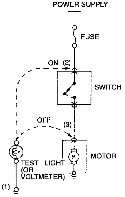3. Then, connect the test light or voltmeter to the motor connector. The test light should not come on, or the voltmeter should indicate no voltage. When the switch is turned on in this state, the test light should come on, or the voltmeter should indicate a voltage, with motor starting to run.