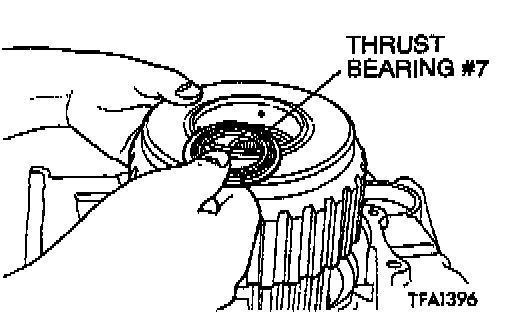 38. Remove the reverse and overdrive clutch and the thrust bearing #7.