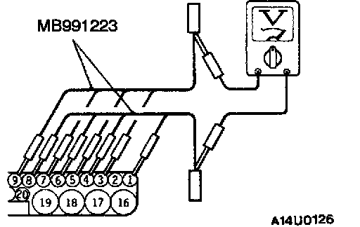 2. Disconnect the ABS-ECU connector, and then use the special tool MB991219 to measure the output voltage at the harness-side connector.