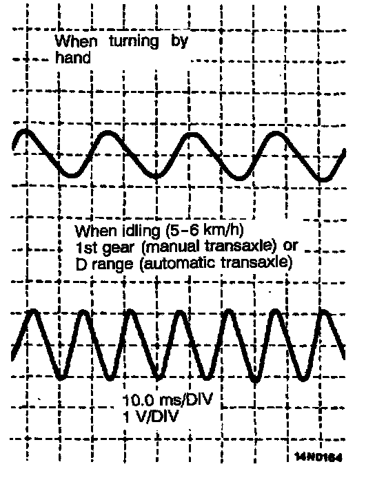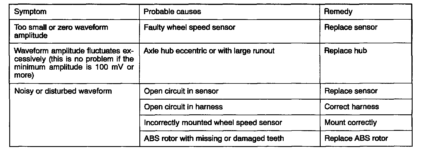NOTE: The wheel speed sensor cable moves following motion of the front or rear suspension. Therefore, it is likely that it has an open circuit only when driving on rough roads and it functions normally on ordinary roads. It is, therefore, recommended to observe sensor output voltage waveform also under special conditions, such as rough road driving.