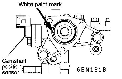 2. Install the camshaft position sensing cylinder so that the white paint mark is facing in the direction shown in the illustration.