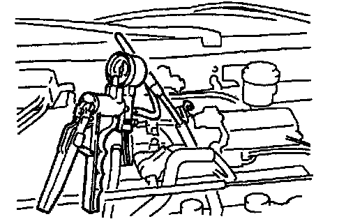 1. Disconnect the vapor hose from the fuel tank to the fuel filler neck tube vent valve (Left one of two hoses shown), and check the mechanical vacuum gauge reading. If the vacuum reading drops, a blockage is in the fuel tank or the roll over valve. If the vacuum reading does not drop, then the blockage is in the EVAP system before the point you disconnected the hose.