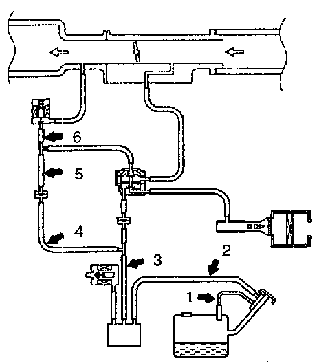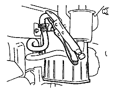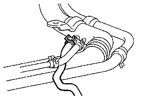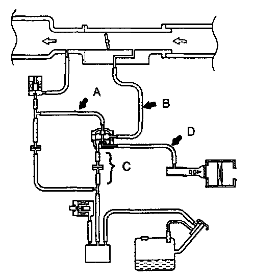 3. To find the vacuum leakage in the system, clamp off the one section of the EVAP system at a time, starting from vacuum hose that connects the fuel tank to the filler neck vent valve (Refer to the illustration). Repeat the performance test. This will determine if the vacuum leak is either in the fuel tank area or in the rest of the system.