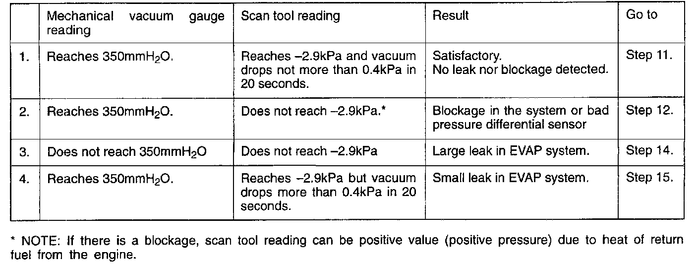 1. If the vacuum reading on the gauge reaches 350 mmH2O but the reading on the scan tool does not reach -2.9kPa, either a system blockage or a bad pressure differential sensor may be the cause.