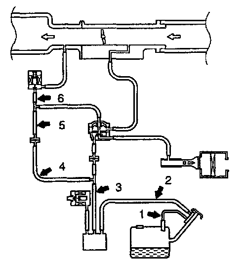 4. Clamp off the vacuum hose one component at a time working towards the front of the vehicle. For example, the next step will be the vacuum hose that connects fuel filler neck vent valve to the canister (2 in the illustration below). Repeat the performance test.