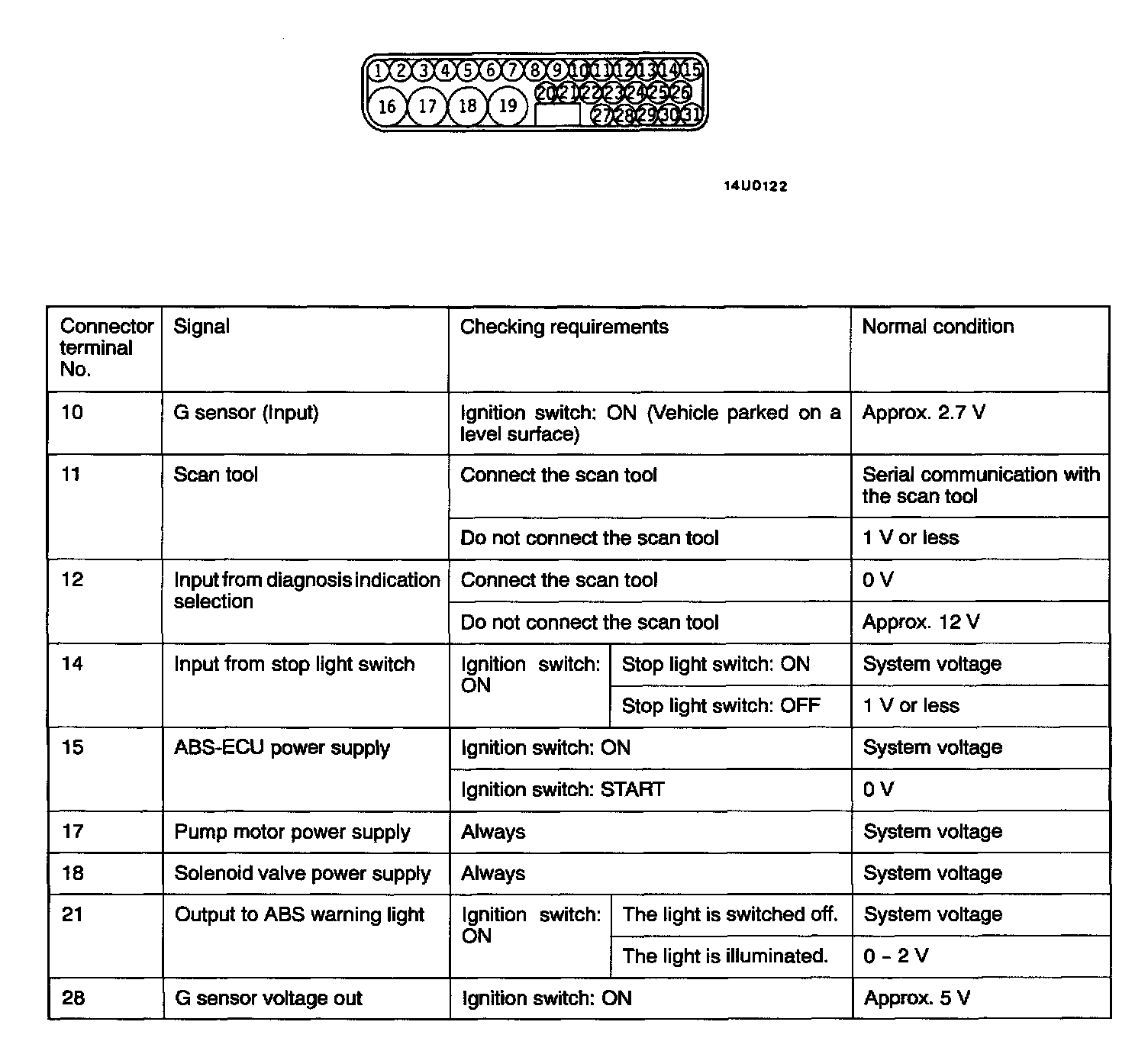 1. Measure the voltages between terminals (16) and (19) (ground terminals) and each respective terminal.