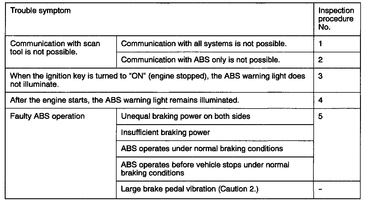 1. If steering movements are made when driving at high speed, or when driving on road surfaces with low frictional resistance, or when passing over bumps, the ABS may operate even through sudden braking is not being applied. Because of this, when getting information from the customer, check if the problem occurred while driving under such conditions as these.
