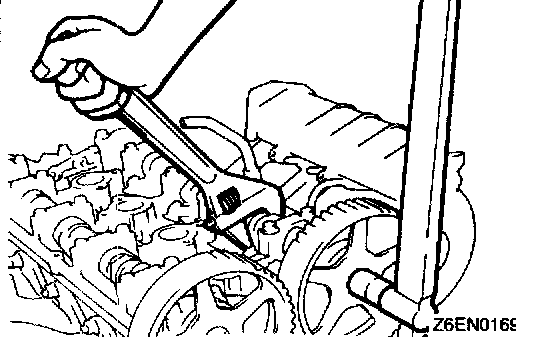 1. Using a wrench, hold the camshaft at its hexagon (between the No. 2 and No. 3 journals) and remove the camshaft sprocket bolt.