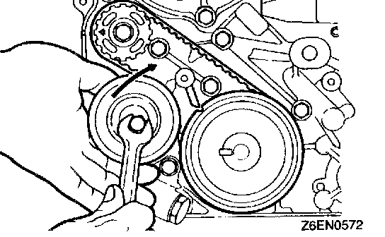 4. Move the tensioner "B" in the direction of arrow while lifting with a finger to give a sufficient tension to the tension side of timing belt. In this condition, tighten bolt to secure tensioner "B". When the bolt is tightened, use care to prevent shaft from turning together. If shaft is turned together, belt will be overtensioned.