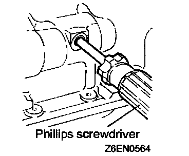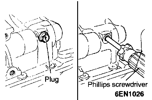 1. Insert a Phillips screwdriver [shank diameter 8 mm (0.31 inch) shaft] through the plug hole on the left side of the cylinder block to block the left counterbalance shaft.