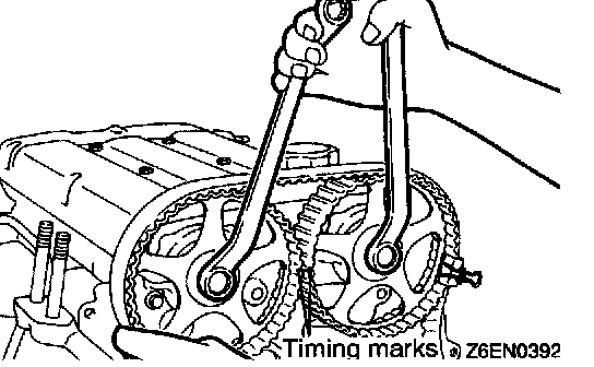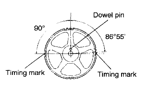 1. Turn the two sprockets so that their dowel pins are located on top. Then, align the timing marks facing each other with the top surface of the cylinder head. When you let go of the exhaust camshaft sprocket, it will rotate one tooth counterclockwise. This should be taken into account when installing the timing belt on the sprockets.