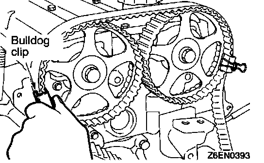 5. Thread the timing belt over the intake side camshaft sprocket and fix it at indicated position by a bulldog clip.