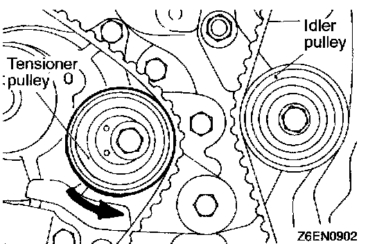 1. Water or oil on the belt shorten its life drastically, so the removed timing belt, sprocket, and tensioner must be free from oil and water. These parts should not be washed. Replace parts if seriously contaminated.