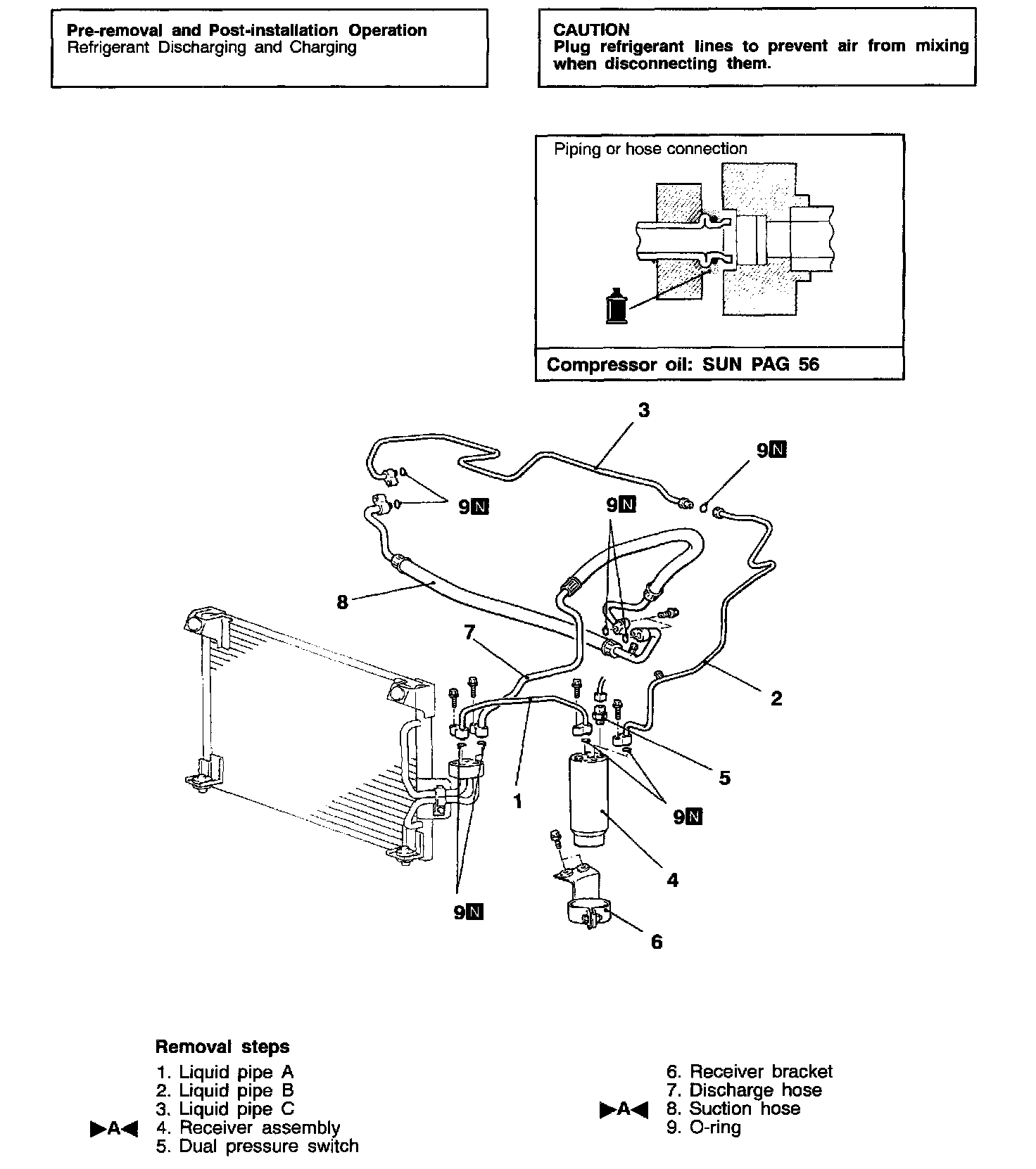 When replacing the suction hose or the receiver assembly, refill them with a specified amount of compressor oil.