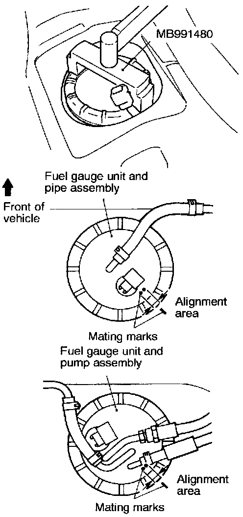 CAUTION: Make sure that the fuel gauge unit and pump assembly (or the fuel gauge unit and pipe assembly) does not turn together with the cap when tightening the cap. If the mating marks are not aligned, the position of the float will not be correct and the fuel gauge indicator light and the fuel level gauge will not operate properly.