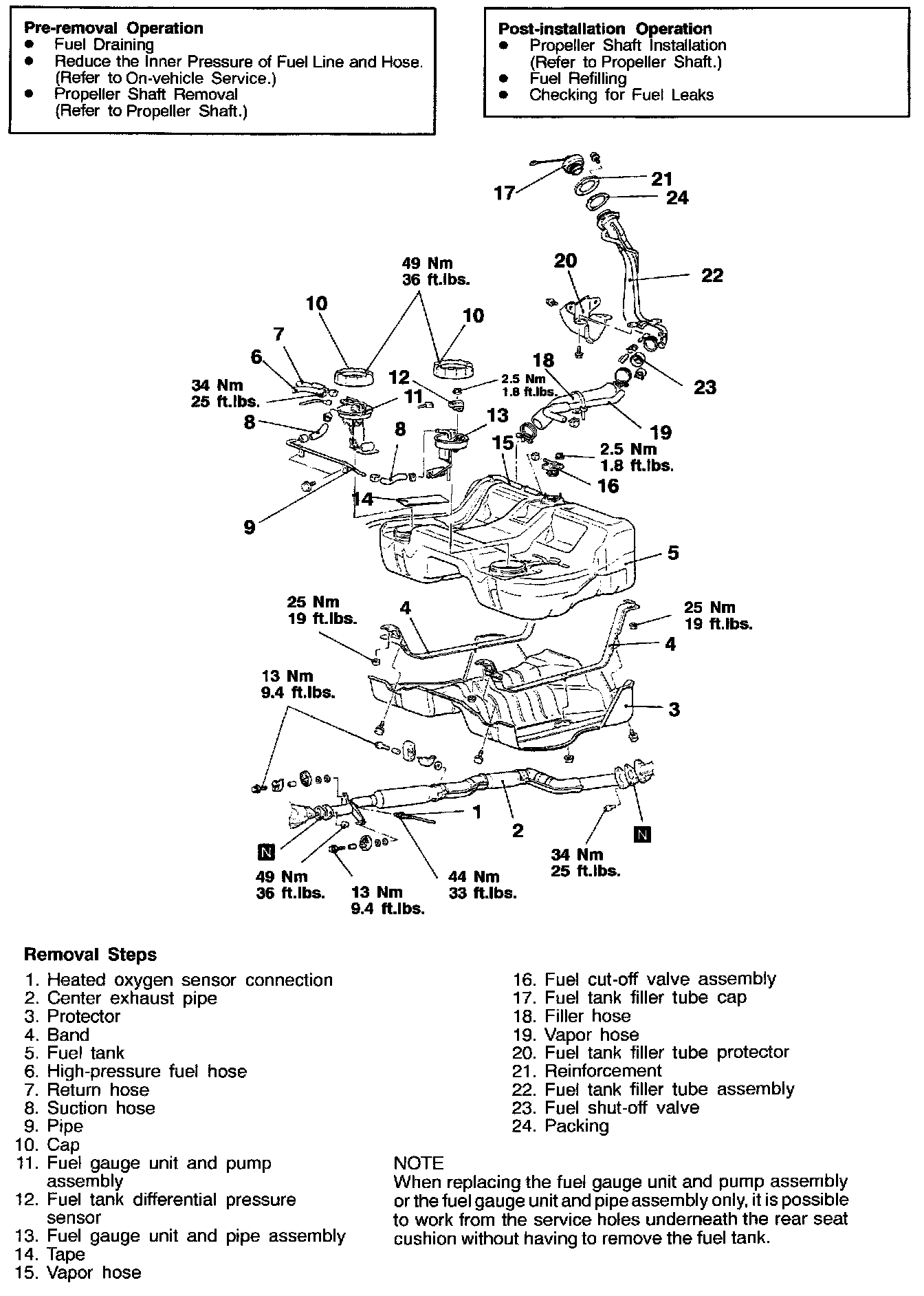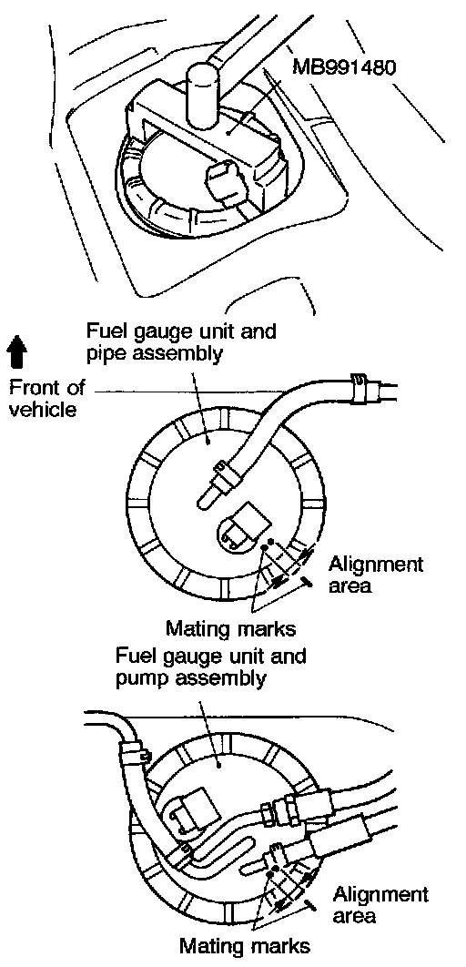 CAUTION: Make sure that the fuel gauge unit and pump assembly (or the fuel gauge unit and pipe assembly) does not turn together with the cap when tightening the cap. If the mating marks are not aligned, the position of the float will not be correct and the fuel gauge indicator light and the fuel level gauge will not operate properly.