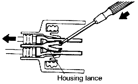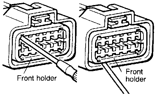 A connector that engages loosely can be repaired by removing the female terminal from the connector housing and raising its lance to establish securer engagement. Removal of the connector terminal used for MFI and ELC-4 A/T control circuit can be done in the following manner.