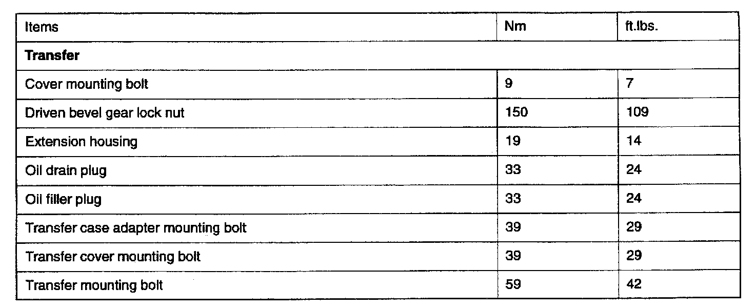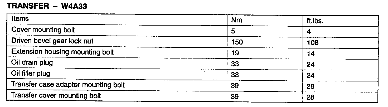 Frm31/F5M33/W5M33 5-spd M/T, Transfer Case Torque: