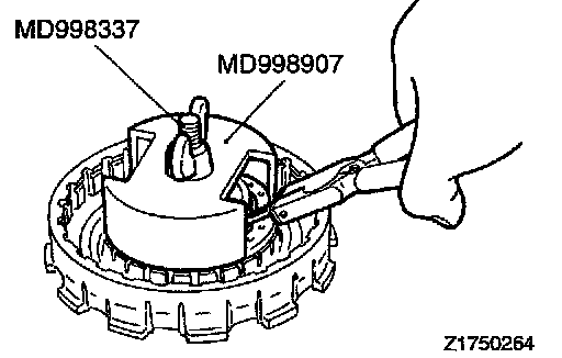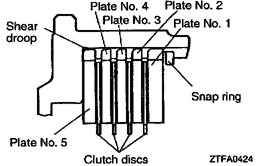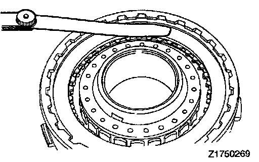 1. Check clearance between the snap ring and clutch reaction plate. To check the clearance, hold entire inside diameter of the clutch reaction plate down with 50 N (11 lbs.) force. If clearance is out of standard value, select a snap ring to obtain the standard value.