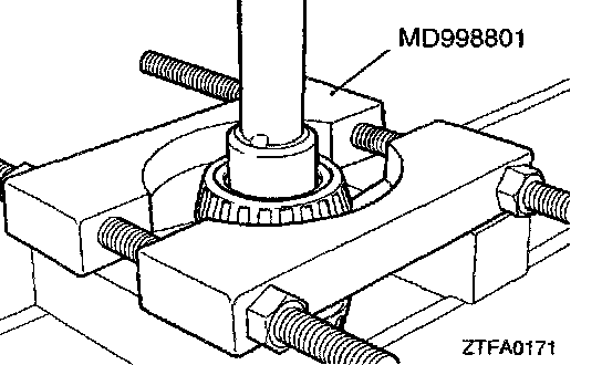 1. Using the special tool, remove the taper roller bearings on both ends of the front output shaft.