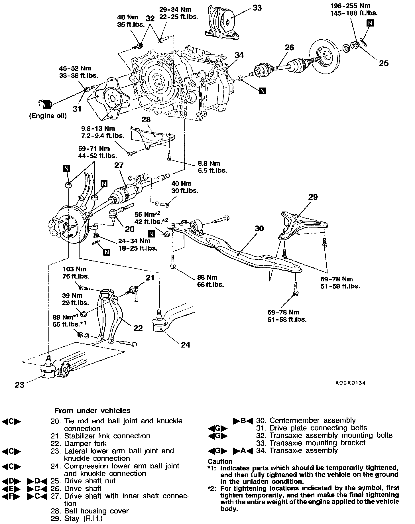 CAUTION: Before securely tightening the drive shaft nuts, make sure there is no load on the wheel bearings.