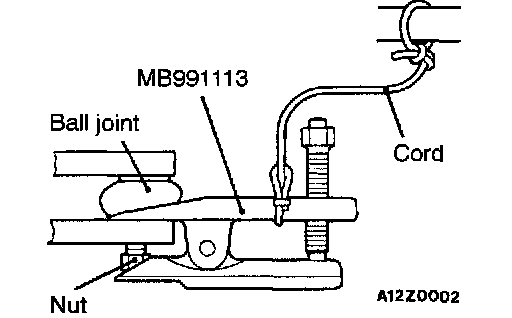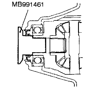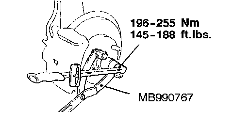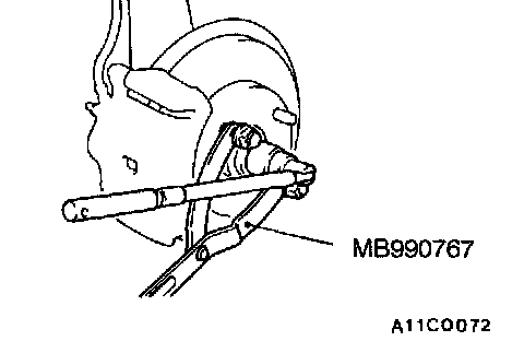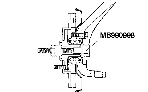 CAUTION: Do not apply the vehicle weight to the wheel bearing while loosening the drive shaft nut. If, however, the vehicle weight must be applied to the bearing (because of moving the vehicle), temporarily secure the wheel bearing by using the special tool, MB990998, etc.