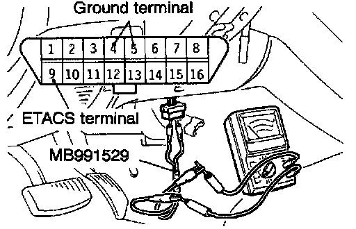 1. Use the special tool to connect a voltmeter between the grounded terminal and the ETACS-ECU terminal of data link connector.