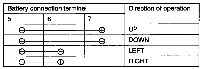 Check that the mirror moves as described in the table when each terminal is connected to the battery.