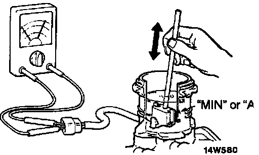 BRAKE FLUID LEVEL SENSOR CHECKThe brake fluid level sensor is in good condition if there is no continuity when the float surface is above "MIN" or "A" and if there is continuity when the float surface is below "MIN" or "A".