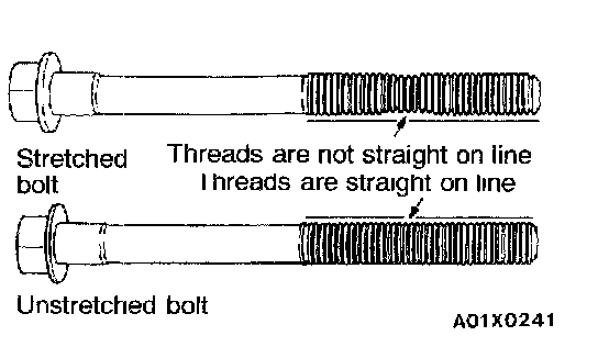 1. Cylinder head bolts should be carefully examined before reuse. If the threads are necked down, the bolts should be replaced. Necking can be checked by holding a scale or straight edge against the threads. If all the threads do not contact the scale, the bolt should be replaced.