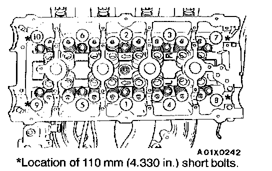 3. Tighten the cylinder head bolts in the sequence shown in figure. Using the 4 step torque turn method, tighten according to the following values.