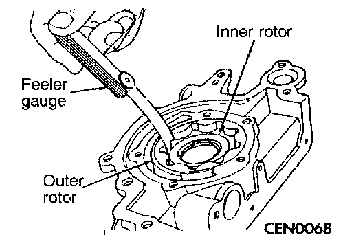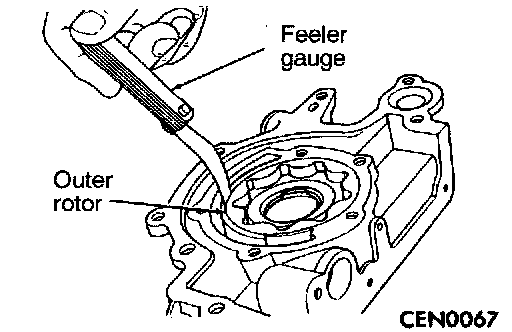 6. Slide outer rotor into pump housing, press to one side with fingers and measure clearance between rotor and housing. If measurement exceeds the limit, replace housing only if outer rotor is in specification.