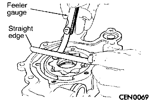 8. Place a straightedge across the face of the pump housing, between bolt holes. If a feeler gauge of 0.102 mm (0.004 inch) or more can be inserted between rotors and the straightedge, replace pump assembly.