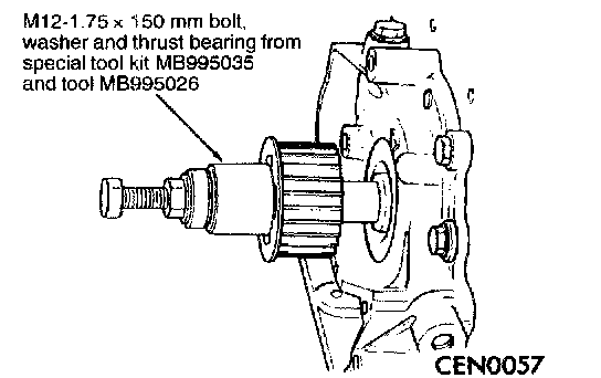 5. Install crankshaft sprocket using M12-1.75 x 150 mm bolt, washer and thrust bearing from Special Tool Kit MB995035 and Tool MB995026.