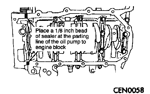 7. Apply Loctite 18718 or equivalent at the oil pump to engine bed plate parting line.