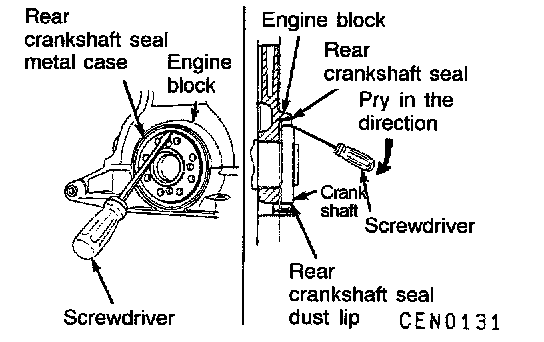 REMOVAL1. Insert a 3/16 flat bladed screwdriver between the dust lip and the metal case of the crankshaft seal. Angle the screwdriver through the dust lip against metal case of the seal. Pry out seal.