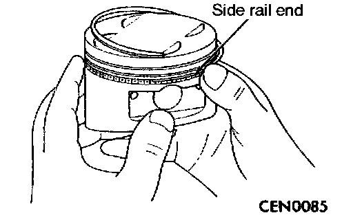 2. Install the side rail by placing one end between the piston ring groove and the expander. Hold end firmly and press down the portion to be installed until side rail is in position. Do not use a piston ring expander.