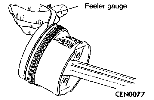 1. Wipe cylinder bore clean. Insert ring and push down with piston to ensure it is square in bore. The ring gap measurement must be made with the ring positioning at least 12 mm (0.47 inch) from bottom of cylinder bore. Check gap with feeler gauge.