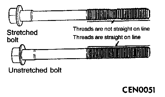 1. Since the connecting rod bearing cap bolts are torqued using a new procedure, they should be examined BEFORE reuse. If the threads are necked down, replace the bolts.