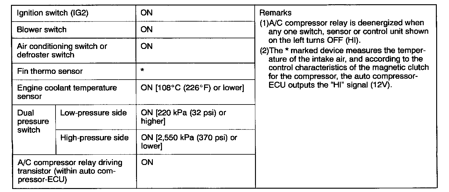 - The dual pressure switch turns OFF when the refrigerant pressure becomes excessively high or low, thus protecting the compressor circuit. (See Table)